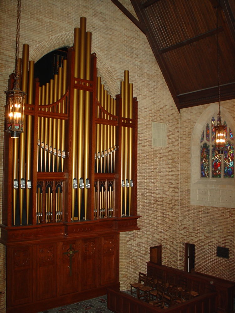The Nichols & Simpson organ at First Presbyterian Church in Little Rock replaces an E. M. Skinner instrument that was built in the Steere factory and had been rebuilt and severely altered several times. The moveable oak three-manual console features an interior of burl eucalyptus with exotic wood inlays. The organ case was designed by Frank Friemel and executed by Quigley Custom Pipe Organ Components. One unique feature of this organ is the commanding Tuba Mirabilis. This stop is hooded and speaks on 15″ of wind pressure. The Tuba is located at the top of the organ in its own expression box which opens into the Choir/Solo expression box, thus giving this stop double expression capability.